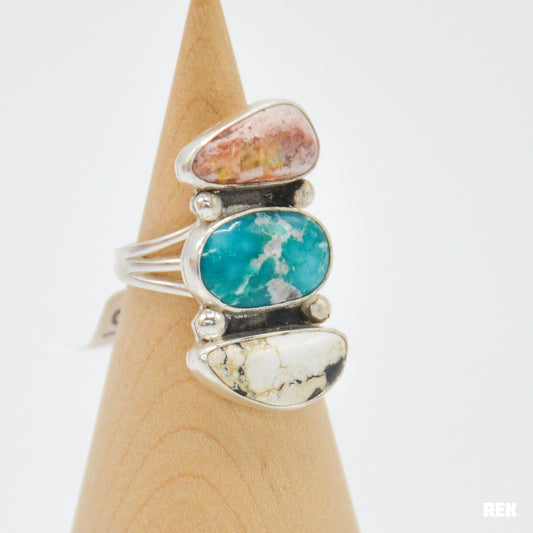 Triple Mexican fire opal, whitewater turquoise, white buffalo size 8