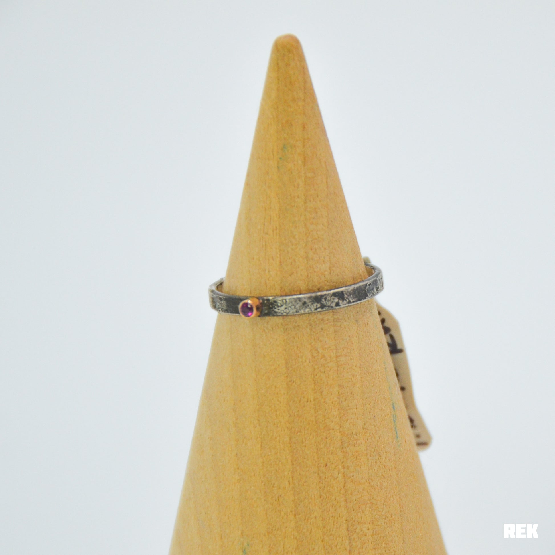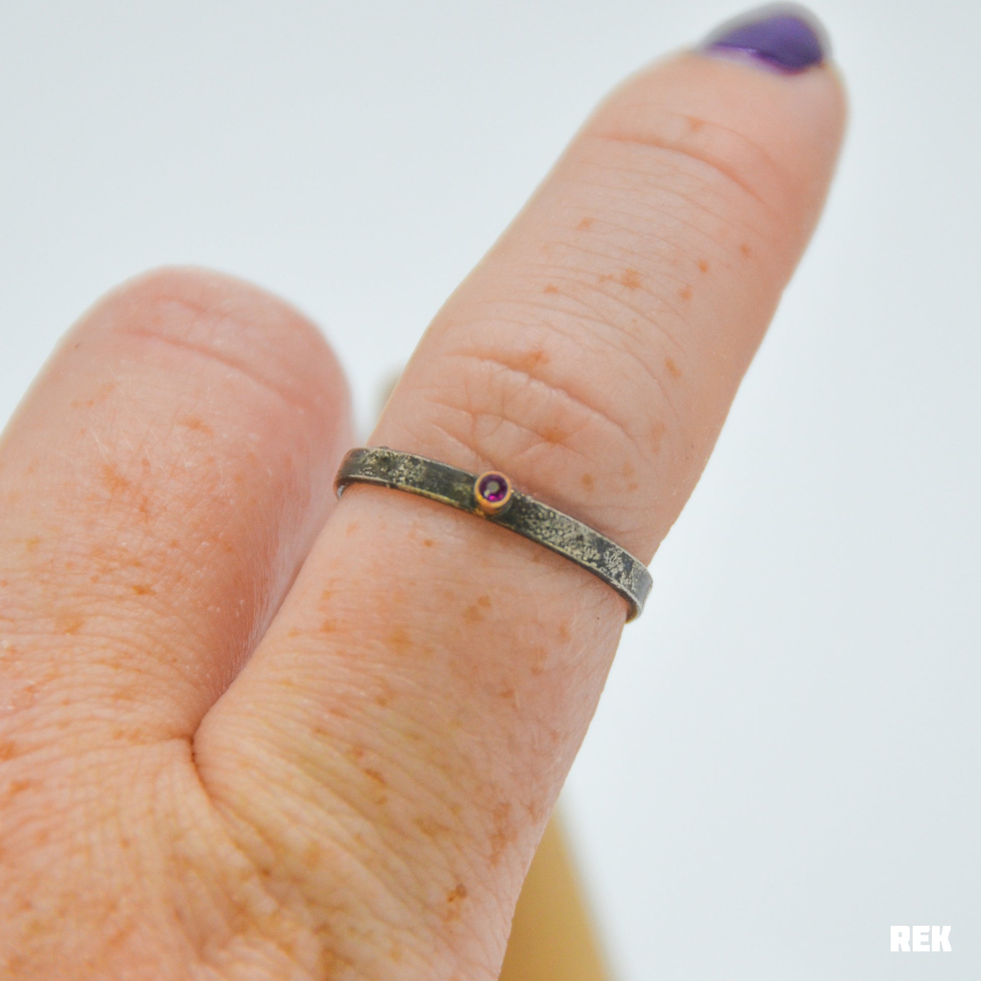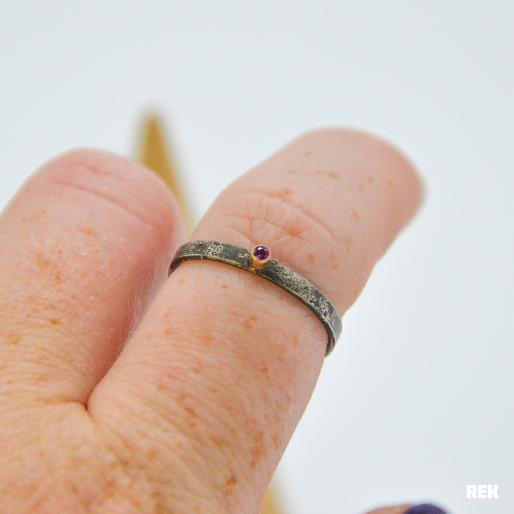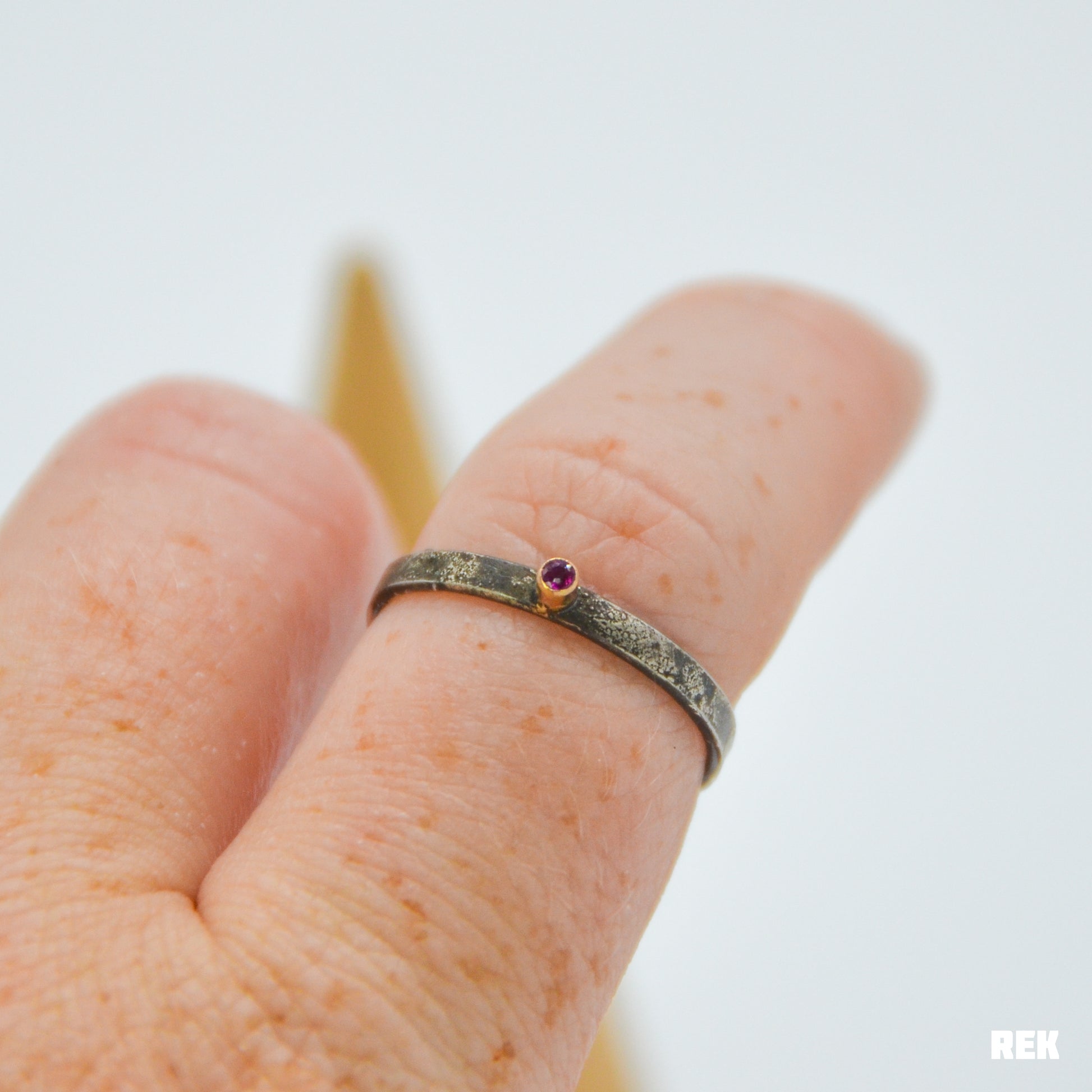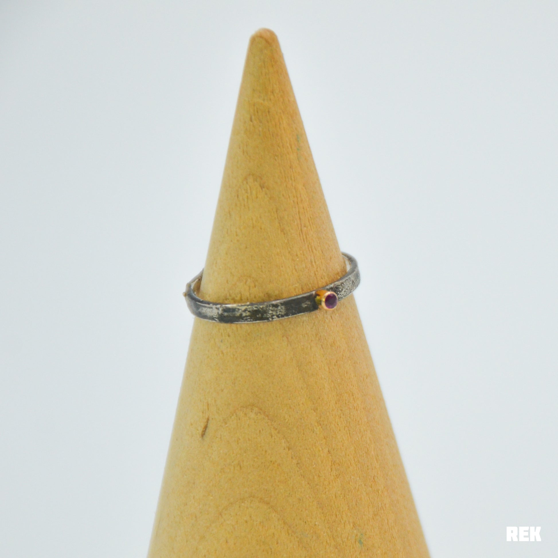 Tiny 1.75mm bright ruby set in 14 karat solid yellow gold on a darkened reticulated sterling silver band.