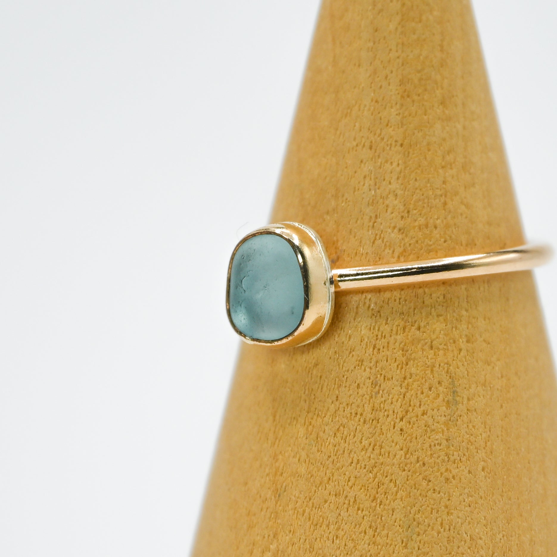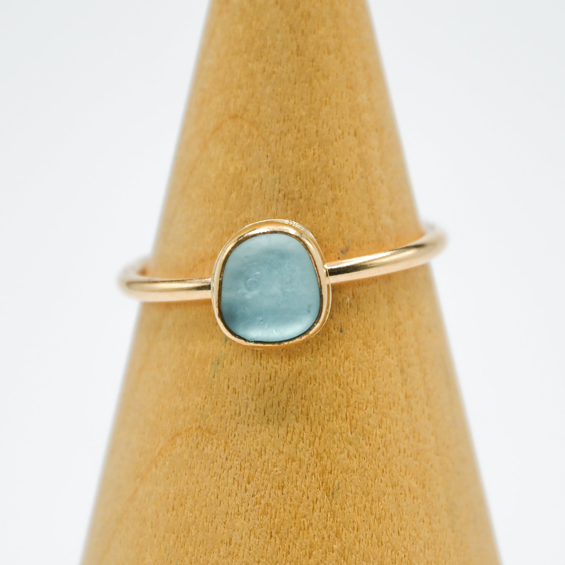 I find all my sea glass in the central coast of California. Sea glass set in 14k yellow gold fill.