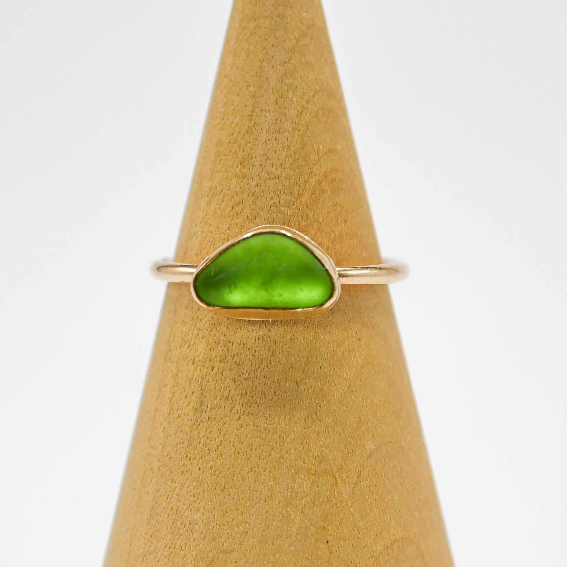 I find all my sea glass in the central coast of California. Sea glass set in 14k yellow gold fill.