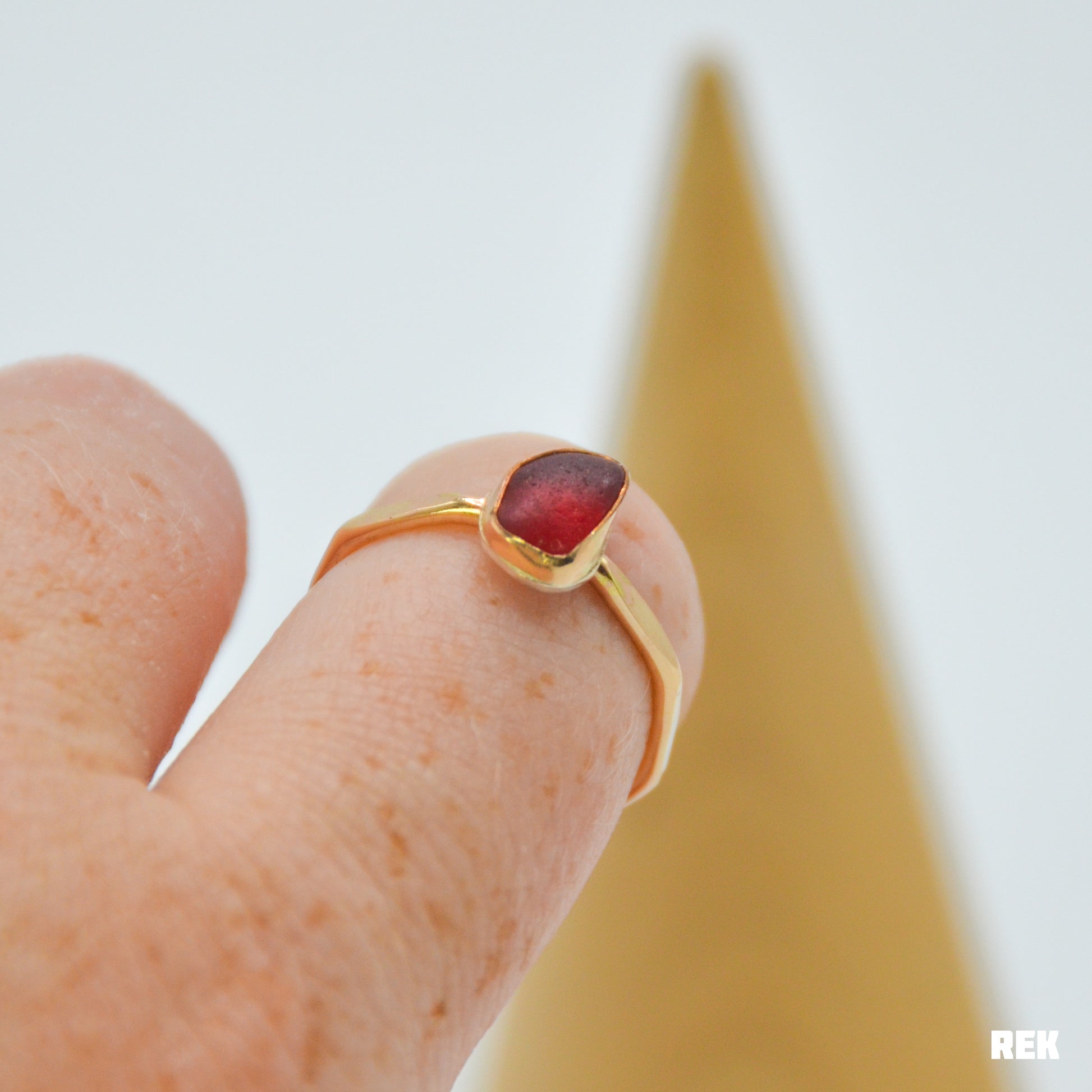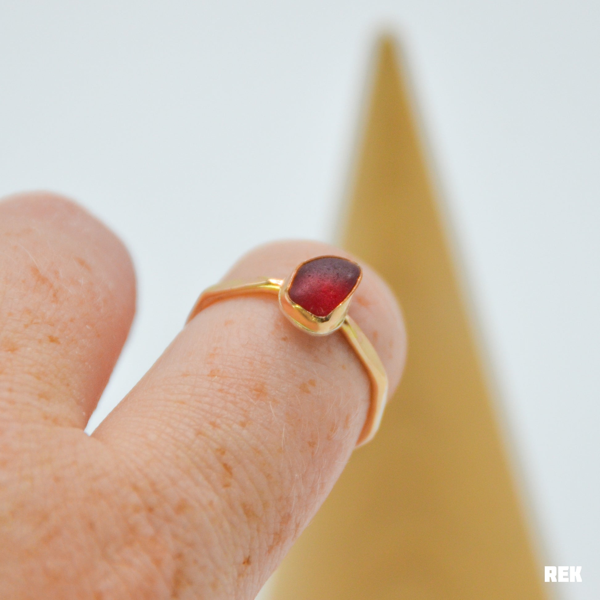 I find all my sea glass in the central coast of California. Red sea glass set in 14k yellow gold fill.