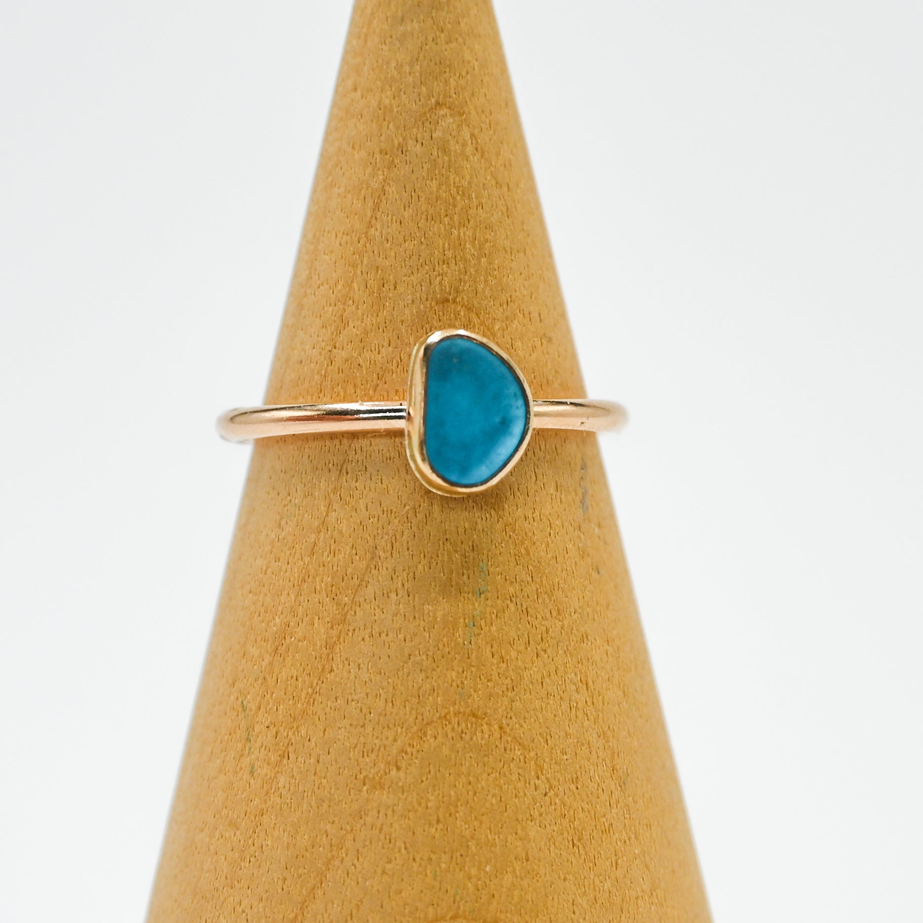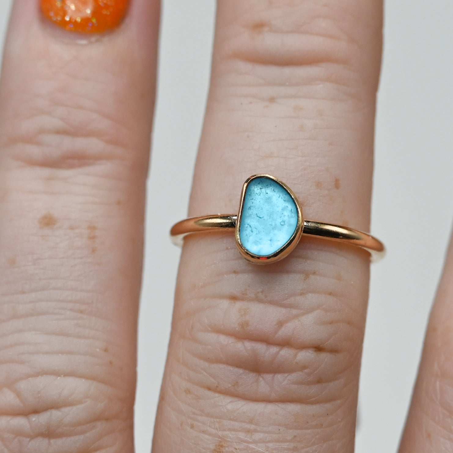 I find all my sea glass in the central coast of California. Sea glass set in 14k yellow gold fill.