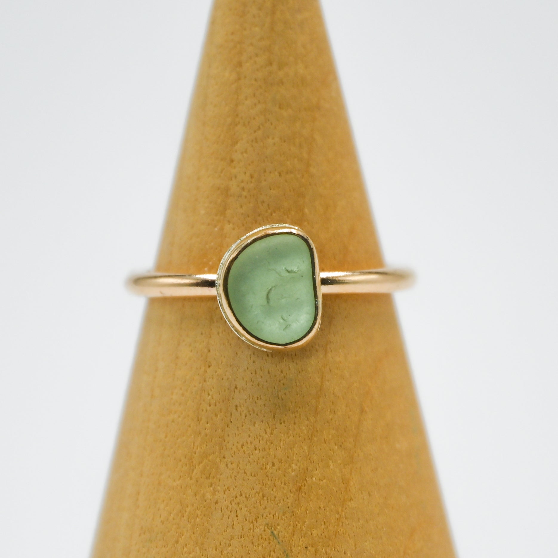 I find all my sea glass in the central coast of California. Sea glass set in 14k yellow gold fill.